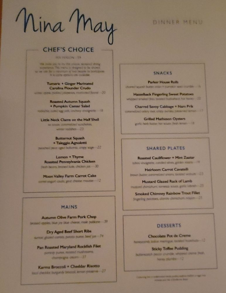 Daily menus posted on ninamaydc.com. This dinner is designed to be shared, so we ask for a minimum of two people to participate.